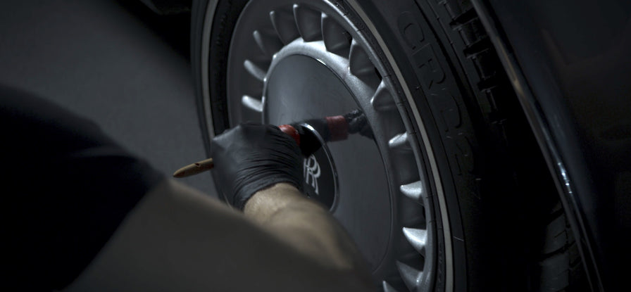 Naše pneumatika pro péči o pneumatiky, která je vhodná i pro pneumatiky s bílými stěnami, je následně nastříkána, aby získala lesk.